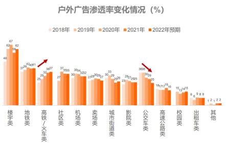 ● 高鐵/火車(chē)類(lèi)戶(hù)外廣告連續(xù)增長(zhǎng),2021年滲透率超過(guò)社區(qū)類(lèi)和機(jī)場(chǎng)類(lèi)。而公交車(chē)類(lèi)戶(hù)外廣告,則連續(xù)走低。