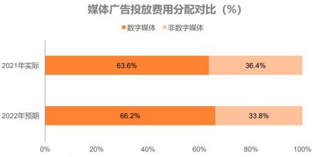 ● 2021年的調(diào)查顯示,數(shù)字媒體獲得了更多的廣告預(yù)算,費(fèi)用占比為63.6%。到了2022年,數(shù)字媒體的分配占比將再提升近3個(gè)百分點(diǎn)。