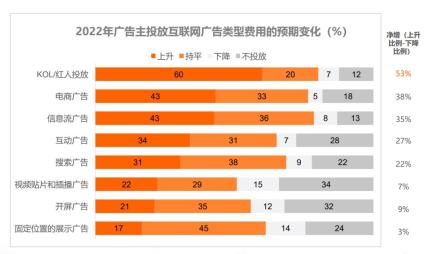 ● 互聯(lián)網(wǎng)廣告類(lèi)型方面,2022年六成廣告主預(yù)期會(huì)增加KOL/紅人的投放費(fèi)用。紅人擁有粉絲群體,自帶流量,擁有穩(wěn)定的原創(chuàng)內(nèi)容輸出能力,同時(shí),在不同紅人之間可以形成組合投放,在電商大促等大型推廣環(huán)節(jié)可以實(shí)現(xiàn)品牌聲量放大。相比之下,視頻貼片和插播廣告、固定位置展示廣告和開(kāi)屏廣告的投放費(fèi)用下降率較高,廣告主對(duì)純展示類(lèi)的互聯(lián)網(wǎng)廣告類(lèi)型興趣下滑。