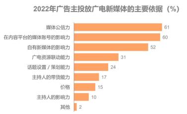● 六成以上的廣告主2022年已經(jīng)或者將會(huì)在廣電新媒體上投放。媒體公信力是廣告主投放廣電新媒體的首要依據(jù),這表明媒體權(quán)威性和價(jià)值觀(guān)能夠在數(shù)字和非數(shù)字媒體貫通,也是廣電新媒體的獨(dú)特優(yōu)勢(shì)所在。