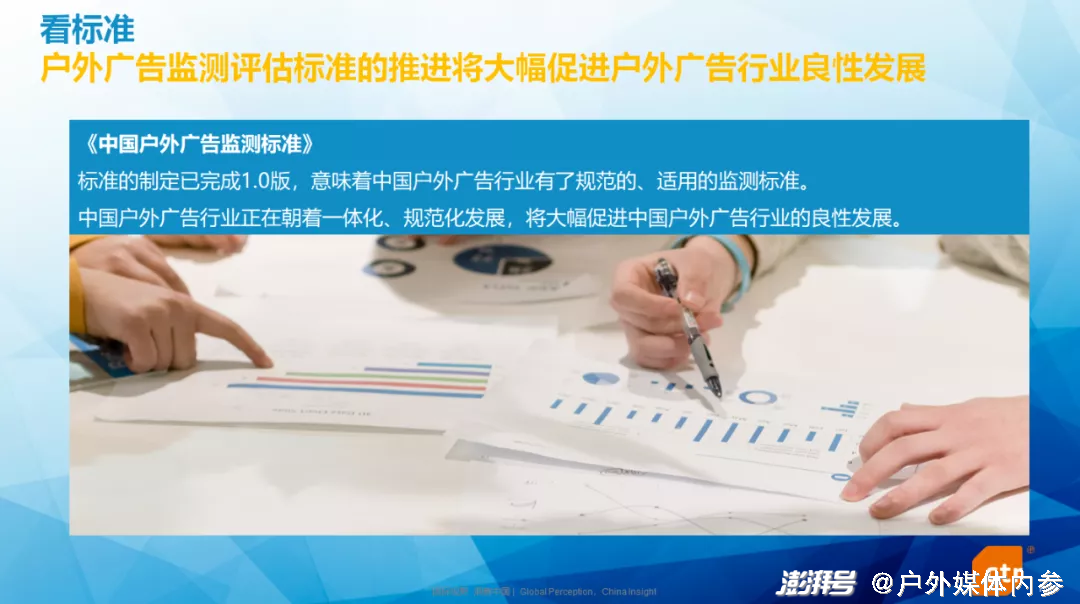 這一標(biāo)準(zhǔn)的發(fā)布,對戶外廣告行業(yè)有著歷史性的意義。長期以來,戶外廣告的監(jiān)測一直是短板,因為缺少相關(guān)的數(shù)據(jù),廣告主無法保障戶外媒體投放的權(quán)益和效果。而戶外廣告公司為了滿足廣告主的需求,也希望找到有效監(jiān)測和評估的系統(tǒng)?;谝陨锨闆r,《中國戶外廣告監(jiān)測標(biāo)準(zhǔn)1.0》建立科學(xué)、規(guī)范、適用的戶外廣告監(jiān)測標(biāo)準(zhǔn),有利于保障廣告主投放權(quán)益,有利于促進市場參與方實現(xiàn)共贏,有利于推動和建設(shè)健康的戶外媒體商業(yè)環(huán)境,有利于實現(xiàn)戶外媒體行業(yè)有序、健康、可持續(xù)發(fā)展。