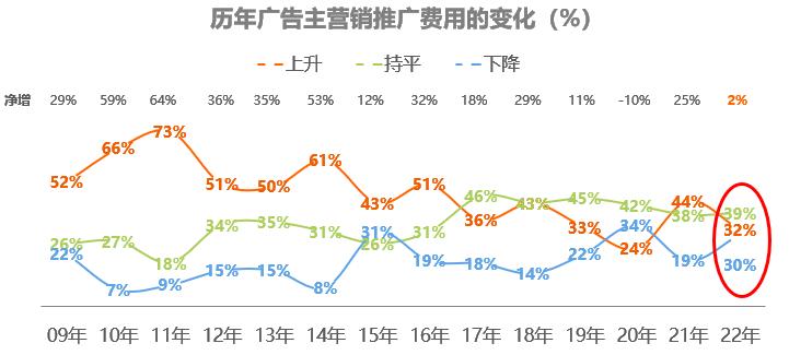 ● 廣告主對(duì)于市場(chǎng)的信心會(huì)直接影響營(yíng)銷(xiāo)預(yù)算的投入。報(bào)告顯示,相比于2021年,2022年廣告主營(yíng)銷(xiāo)預(yù)算凈增比例出現(xiàn)收窄。32%的廣告主表示會(huì)提高營(yíng)銷(xiāo)費(fèi)用,明顯低于去年的44%,而表示會(huì)降低營(yíng)銷(xiāo)費(fèi)用的廣告主則占30%,凈增長(zhǎng)幅度僅為2%,但仍好于2020年。